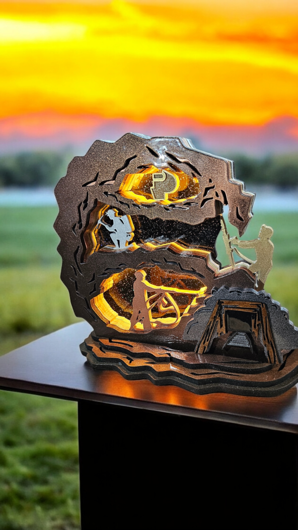 Reconocimiento para mineros de 22 cm de ancho por 18 cm de alto, diseñado para homenajear su labor. Disponible en dos versiones: una básica a 2200 pesos y otra con sistema de iluminación a 2800 pesos, que resalta cada detalle con elegancia y distinción.